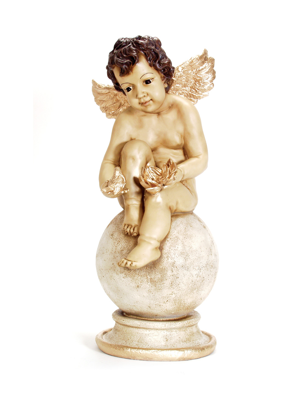 Anjo sentado na Bola com Flor e Pássaro